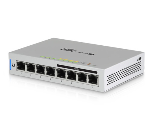 The UniFi Switch 8 60W offers the flexibility of (8) Gigabit Ethernet ports with (4) auto-sensing PoE ports to power your UniFi access points and other PoE devices.
